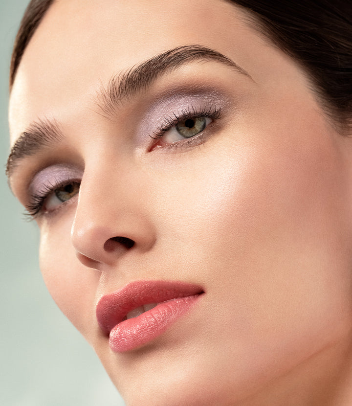 A fresh pastel look with an accent on pearlescent lilac eyes and a chic coral lip is the prettiest way to celebrate the incoming beauty of Spring.