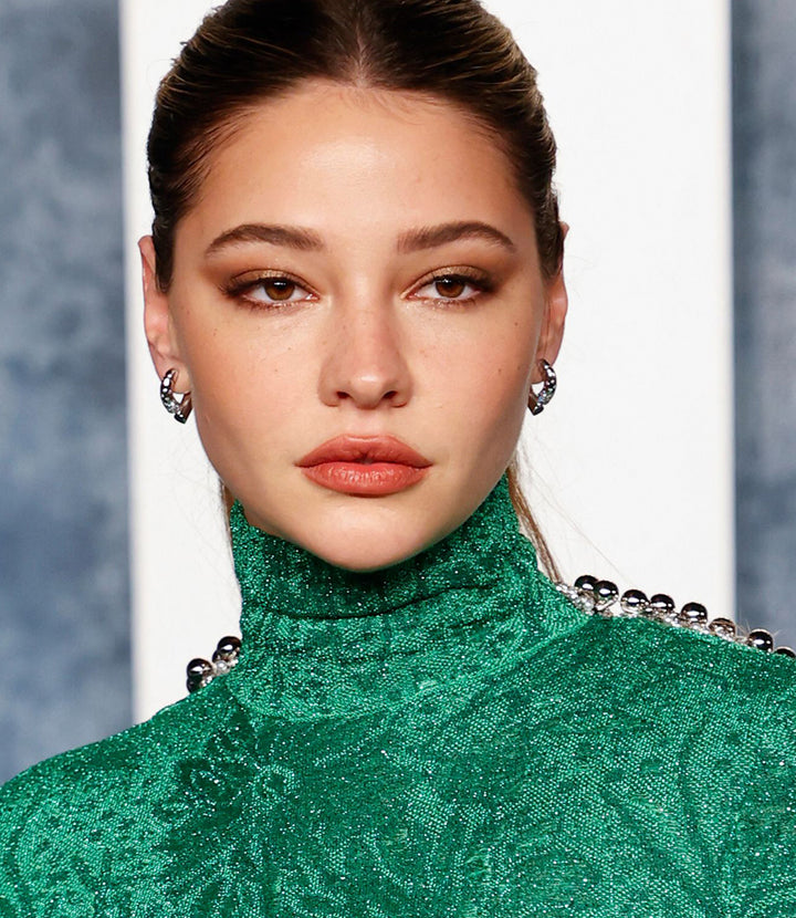 Chantecaille partnered with celebrity makeup artist Jen Tioseco to create a bronzed look with siren eyes and apricot lips on actress Madelyn Cline at the 2023 Vanity Fair Oscars Party.