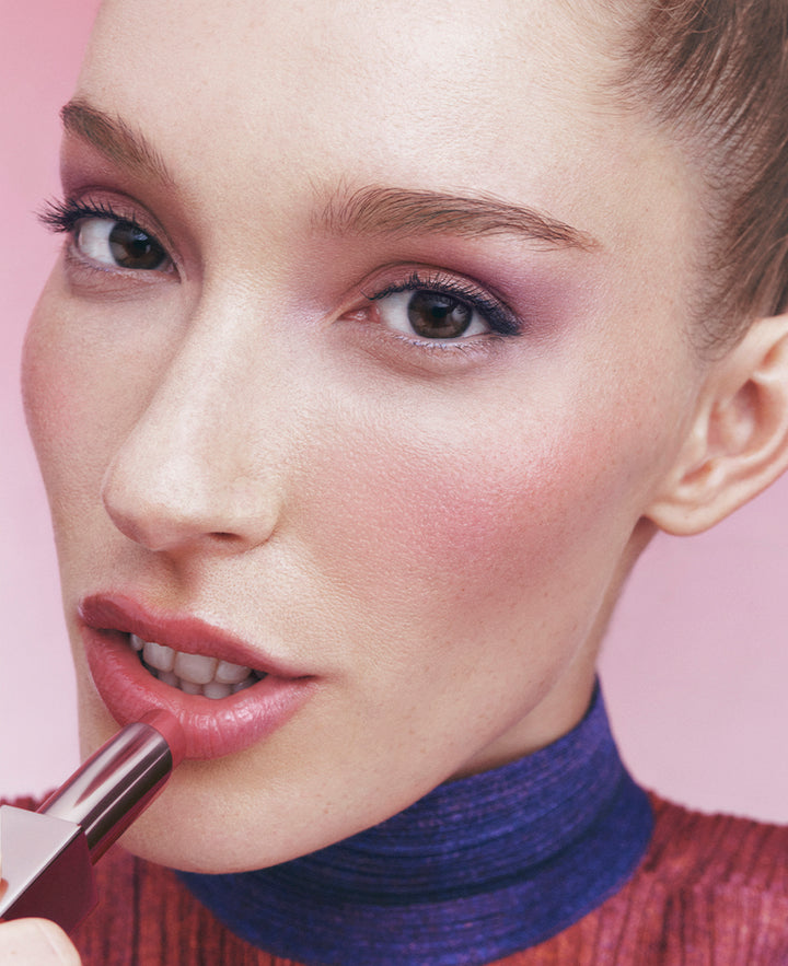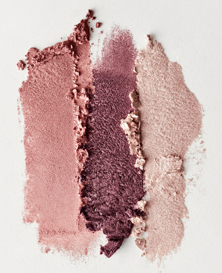3. Using the Dawn Eye Trio, apply the warm pink satin shade across the entire lid with the Shade and Sweep Brush. Then using the Precision Blend Brush, apply the pearlized garnet shade into the crease to create depth. With a wiped Shade and Sweep brush, apply the lustrous pale pink shade at the center of the eyelid and across the browbone.