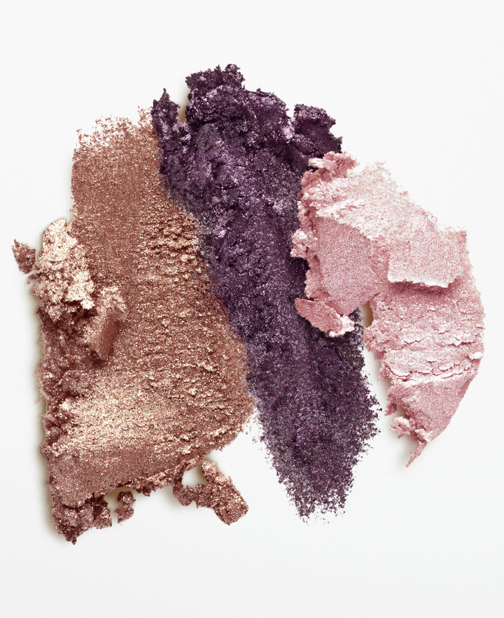 3. Using the Dusk Eye Trio, apply the opalescent pink shade across the entire lid with the Shade and Sweep Brush. Then using the Precision Blend Brush, apply the shimmer taupe shade into the crease to create depth. With a wiped Precision Blend Brush, apply the deep amethyst shade at the outer corners of the lashline, smoking outward.
