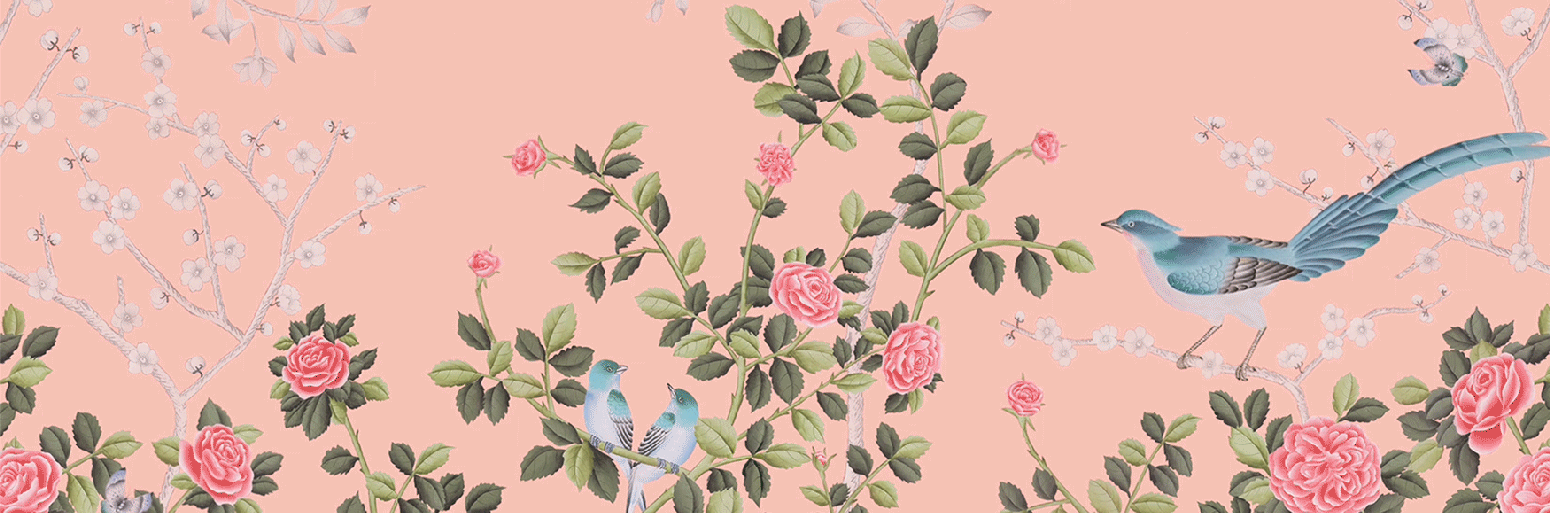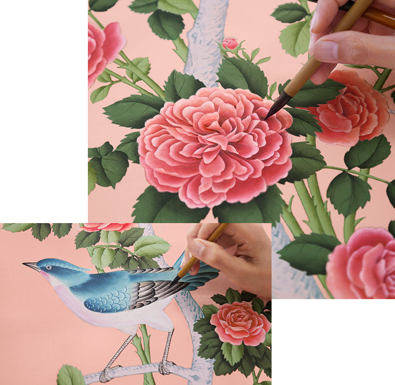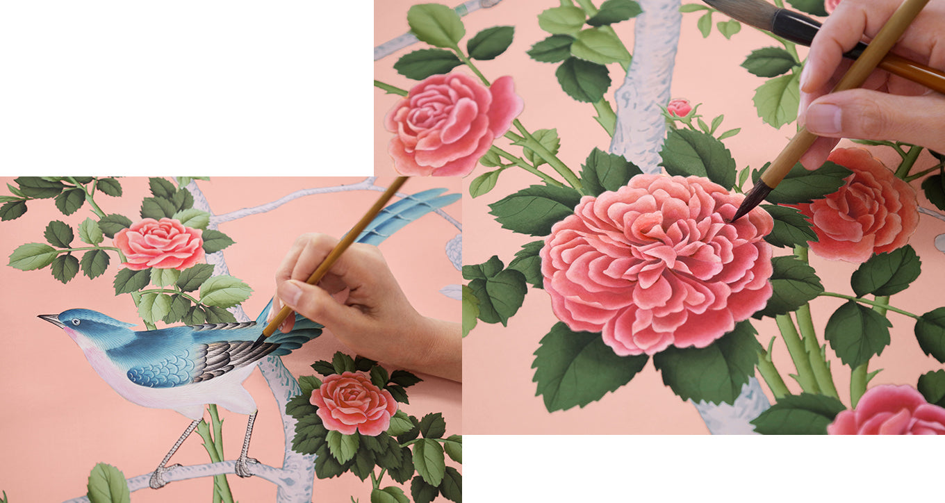 Olivia and Sylvie had been admirers of de Gournay’s exquisite hand-painted wall coverings for years before deciding to pitch the haute British wallpaper house an idea: Would the artisans collaborate with them to create a bespoke design with which to decorate the Spring ‘19 Darby Rose fragrance (a re-imagined version of a classic Chantecaille scent) and Lumière Rose highlighter? What followed was the stuff of design dreams—a signature chinoiserie motif became the starting point for a full-on botanical rhapsody.