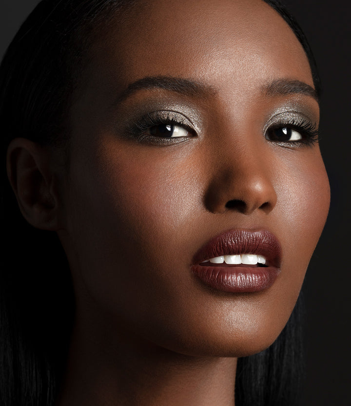 Creating a dramatic smoky eye with an unexpected shade creates a modern look that’s primed for party season. A deep plum lip adds a polish but doesn’t take away from the eyes’ dramatic effect.