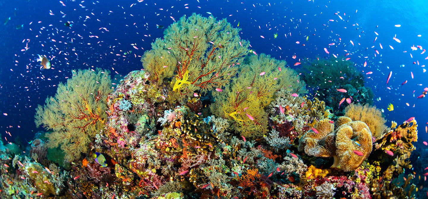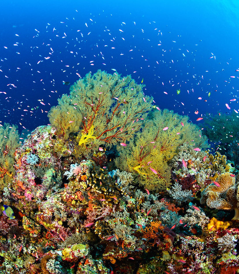 Photos from top: Tubbataha Reefs Natural Park in the Philippines, 2017 Platinum Global Ocean Refuge; the coast at Tubbataha Reefs; Sarah Hameed; closeups of a sea anemone and an orange basket star covering a Picasso sponge at Davidson Seamount, California (courtesy of NOAA and MBARI); underwater at Tubbataha Reefs. All other images courtesy of Marine Conservation Institute.