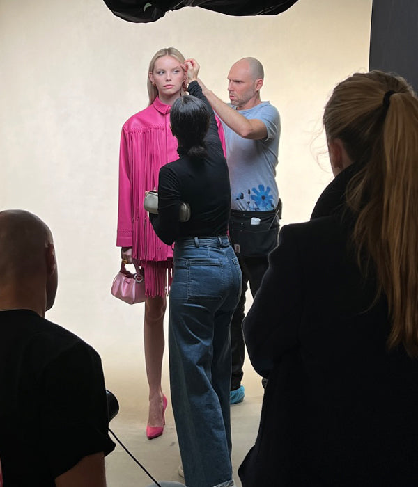 It's always the clothes. The nature-inspired collection still had a lot of edge. I mimicked the bolder elements of the collection by creating a defined, lifted eye while maintaining softer pinks on the lips and cheeks. There were bits of shine in the collection as well and that was where the glowing skin came ināI wanted it to still beam where the sun hit and in the evening shots.