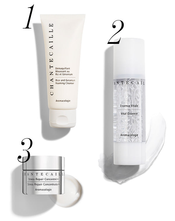 3. Finish with Stress Repair Concentrate+, an eye cream with anti-wrinkle hexapeptide. “It really works great for expression lines, laugh lines and in and around the eye area.” Take a pea-size amount, blend between your fingertips to warm it, then dab in and around the eye area and on facial expression lines.