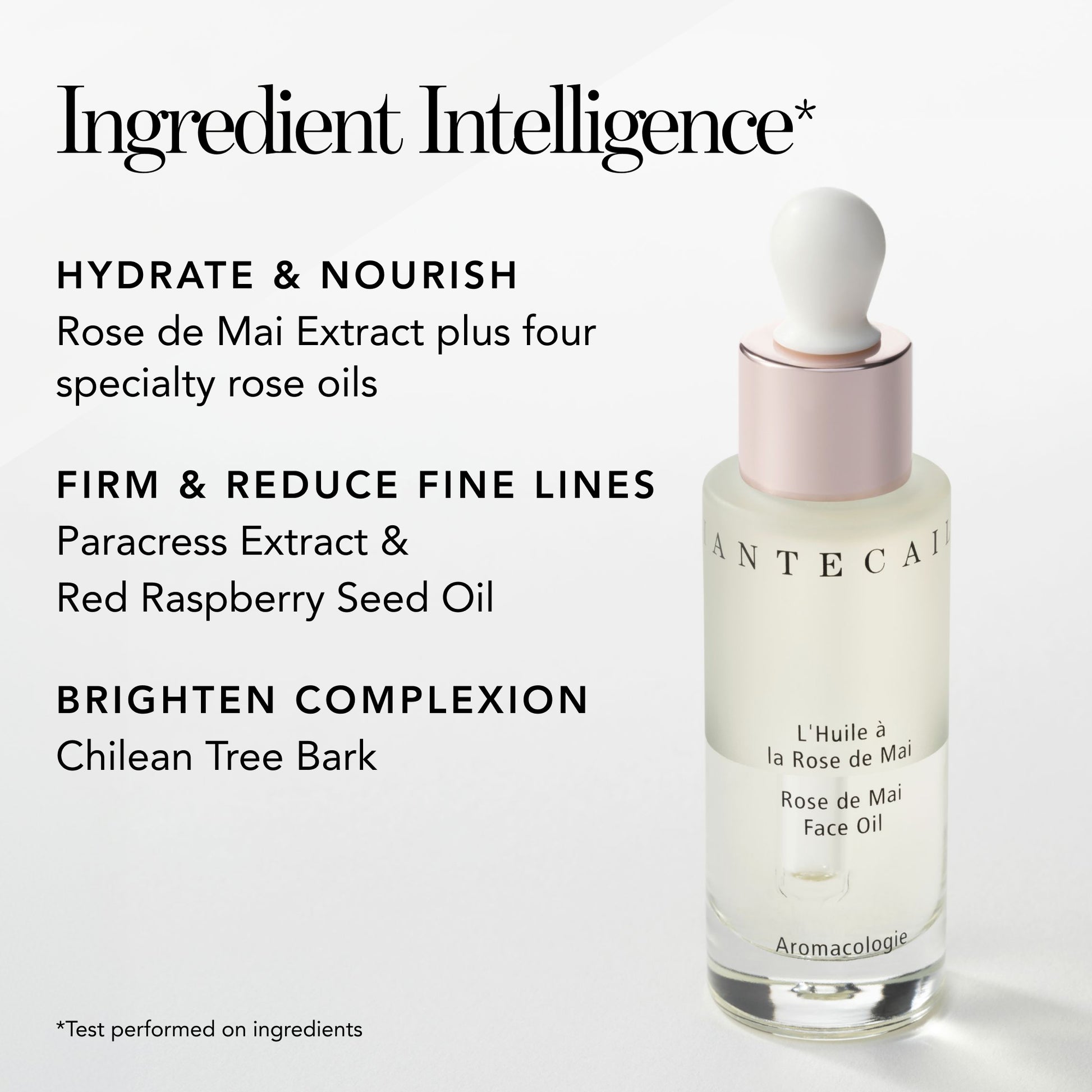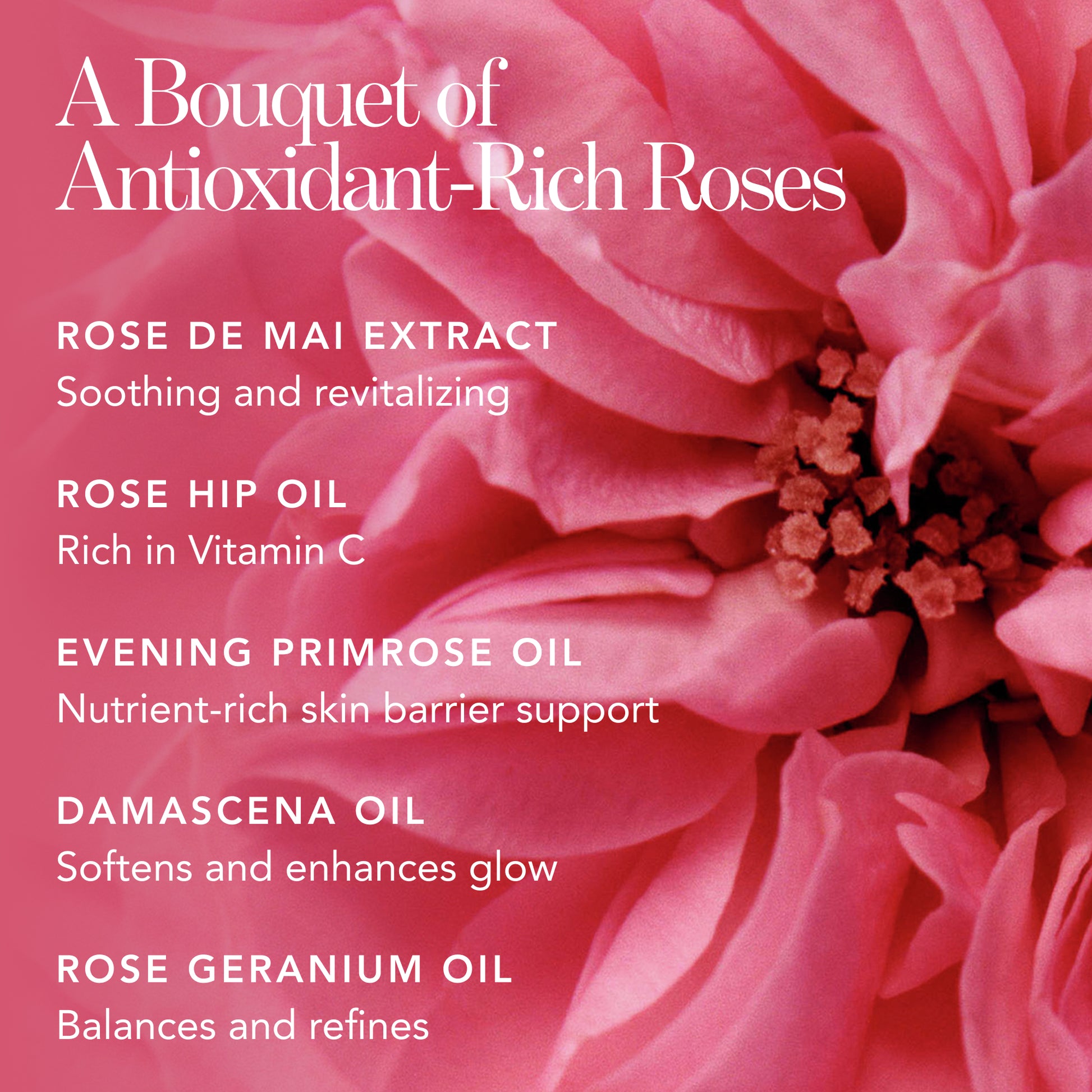 Prunus Amygdalus Dulcis (Sweet Almond) Oil, Squalane, Caprylic/Capric Triglyceride, Prunus Armeniaca (Apricot) Kernel Oil, Vitis Vinifera (Grape) Seed Oil, Rosa Centifolia (Rose De Mai) Flower Extract, Borago Officinalis Seed Oil, Calophyllum Inophyllum Seed Oil, Camellia Japonica Seed Oil, Oenothera Biennis (Evening Primrose) Oil, Rubus Idaeus (Raspberry) Seed Oil, Rosa Canina Fruit Oil, Acmella Oleracea Extract, Rosa Damascena Flower Oil, Algae Extract, Brassica Campestris (Rapeseed) Seed Oil, Pelargonium Graveolens Oil, Rosmarinus Officinalis (Rosemary) Leaf Extract, Diacetyl Boldine, Tocopherol [Citronellol, Geraniol, Linalool, Citral, Farnesol]
